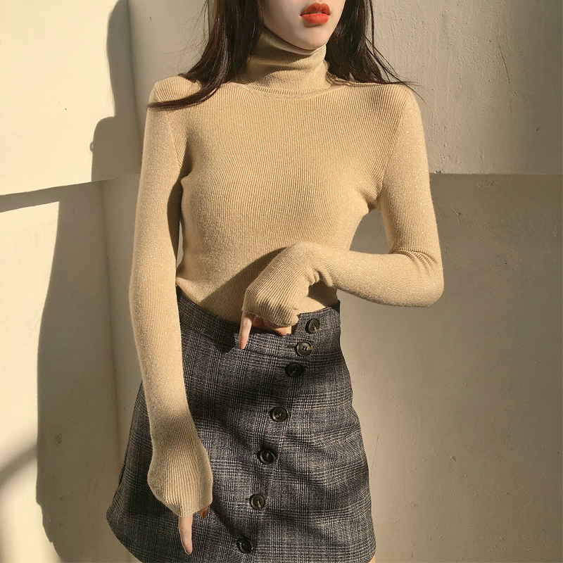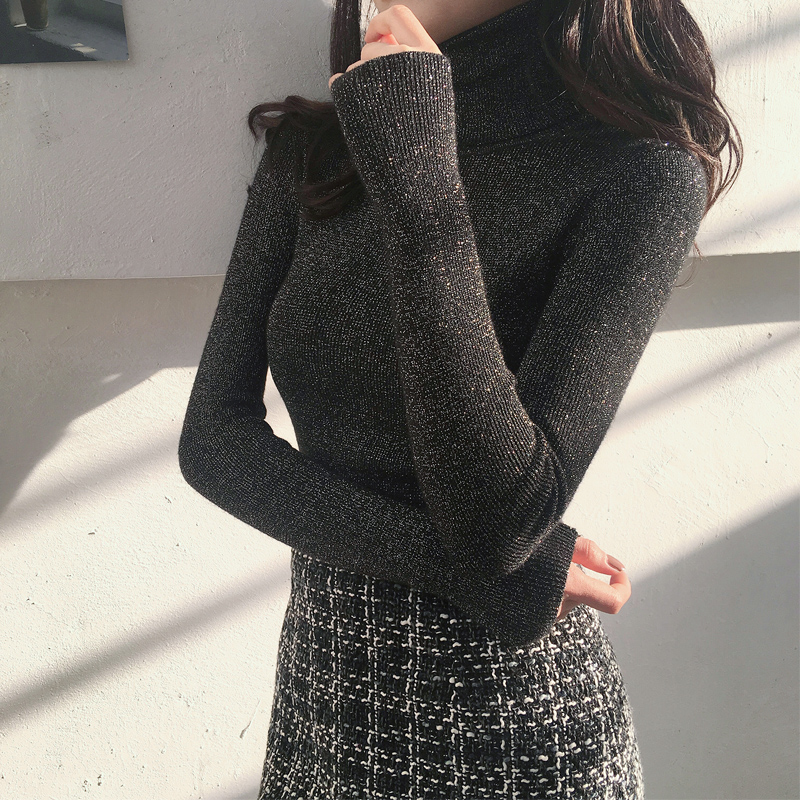 / 秋季新款chic韓版修身顯瘦高領亮絲針織衫港風女長袖毛衣打底上衣