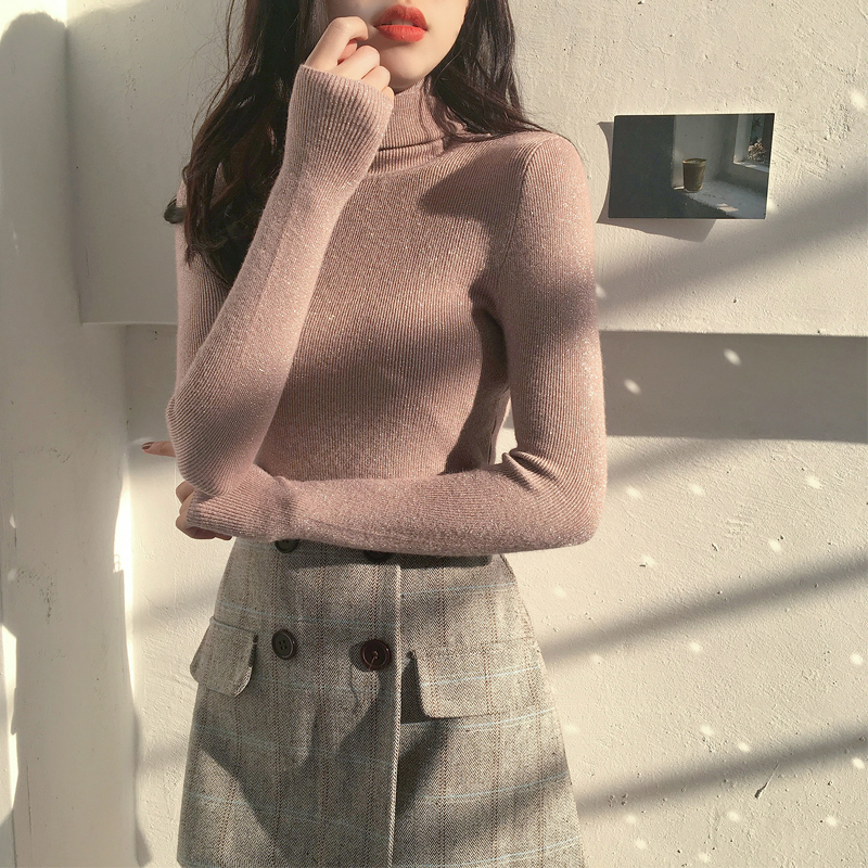 秋季新款chic韓版修身顯瘦高領亮絲針織衫港風女長袖毛衣打底上衣