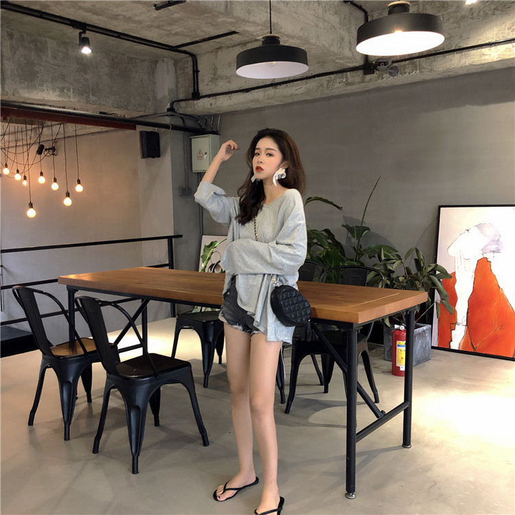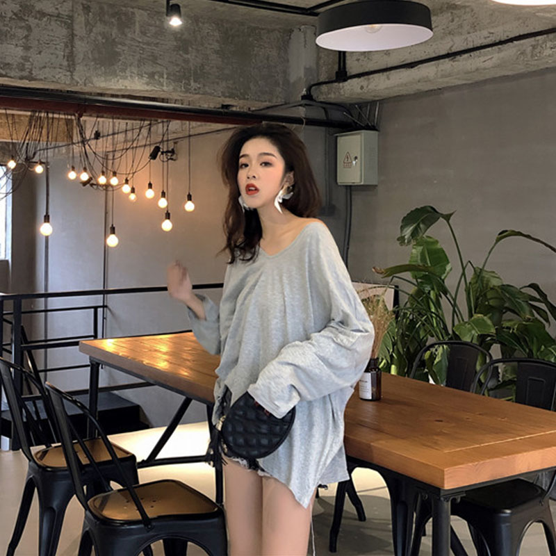 / 早秋下半身失蹤長袖兩穿V領新款設計感時尚百搭褶皺露背中長款T恤