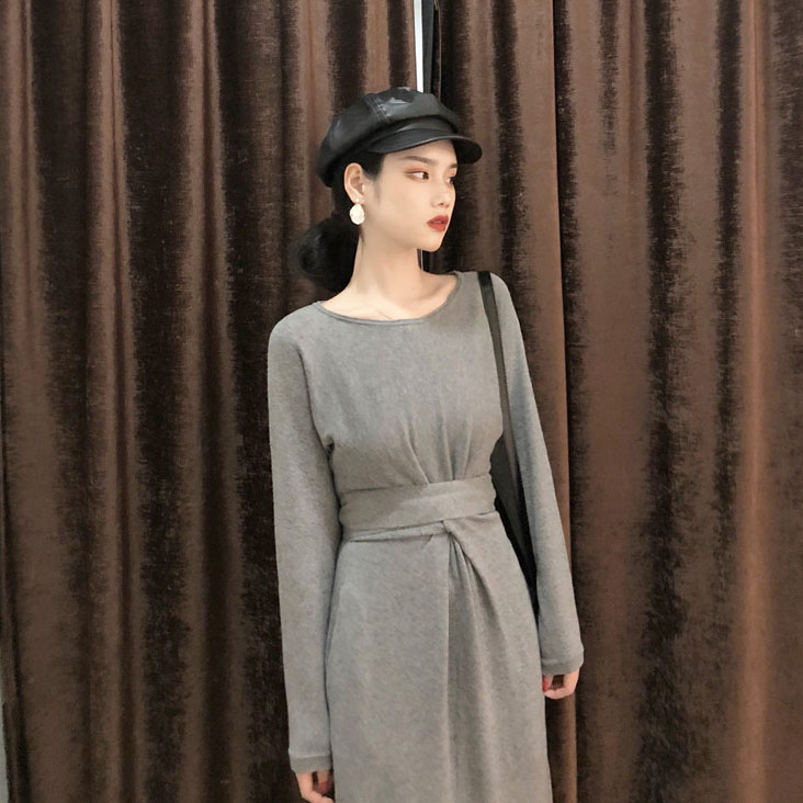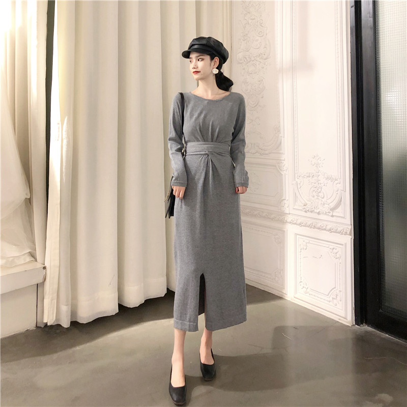 / 韓國復古風連衣裙女秋冬2018新款百搭收腰綁帶修身顯瘦長款針織衫