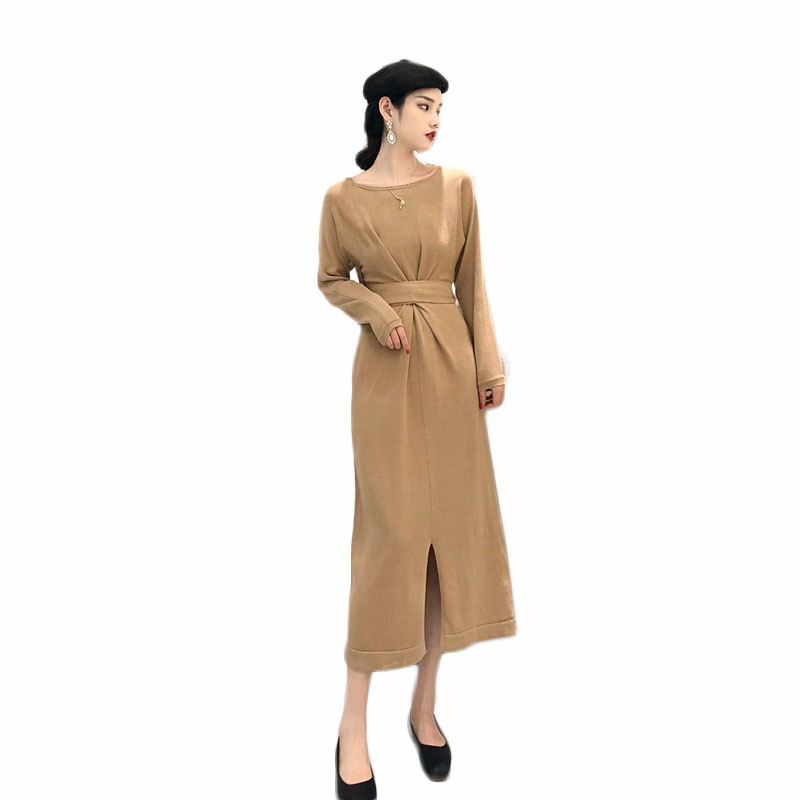 韓國復古風連衣裙女秋冬2018新款百搭收腰綁帶修身顯瘦長款針織衫