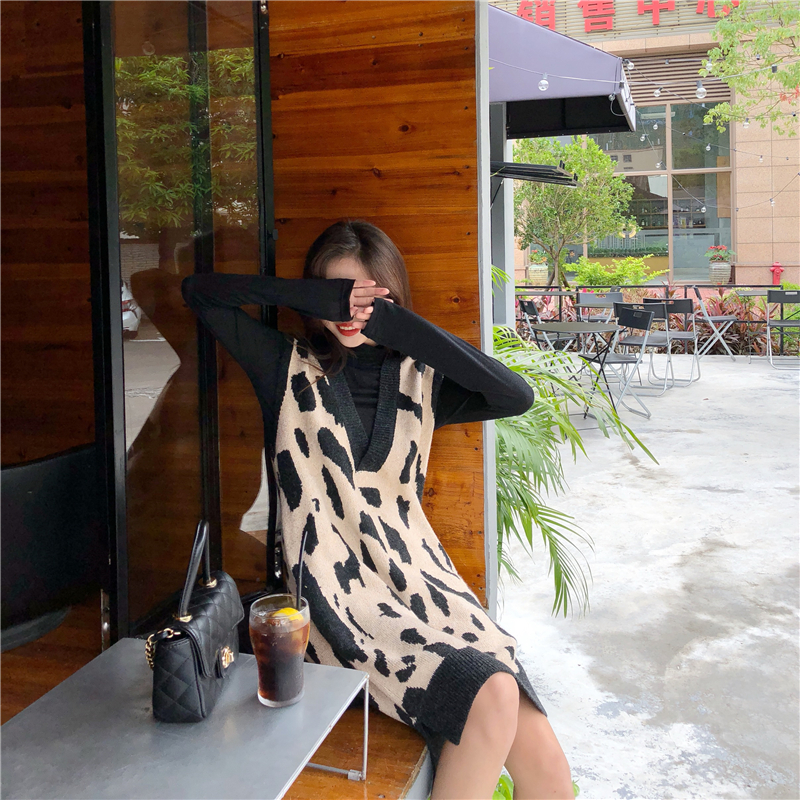 / 秋冬時尚女裝新款韓版chic慵懶風寬松百搭豹紋V領中長款針織馬甲