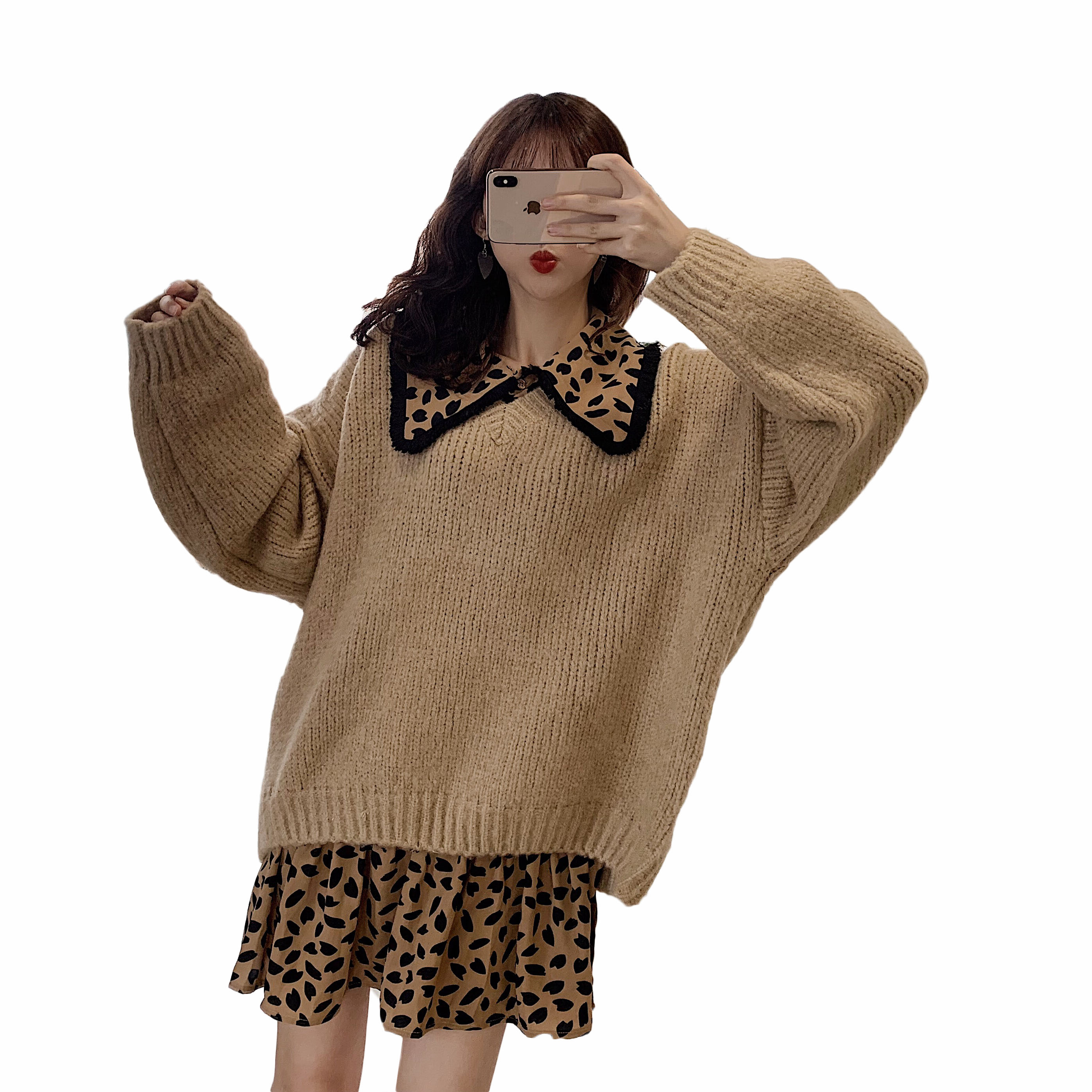韓版百搭寬松套頭V領長袖加厚毛衣女秋冬2018新款+豹紋打底連衣裙