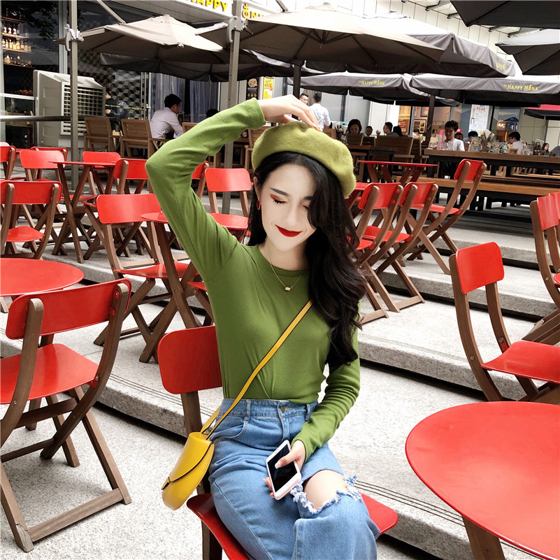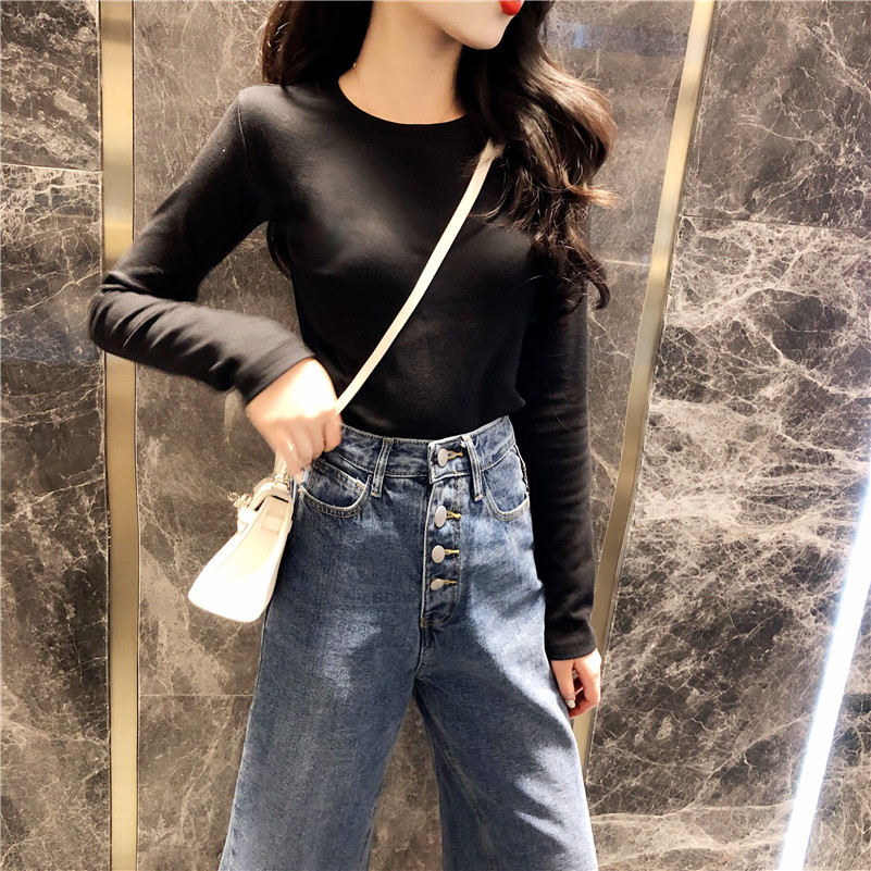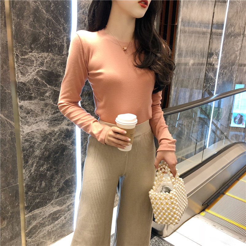 2018早秋上衣女新款韓版chic復古顯白圓領長袖加薄絨磨毛打底T恤