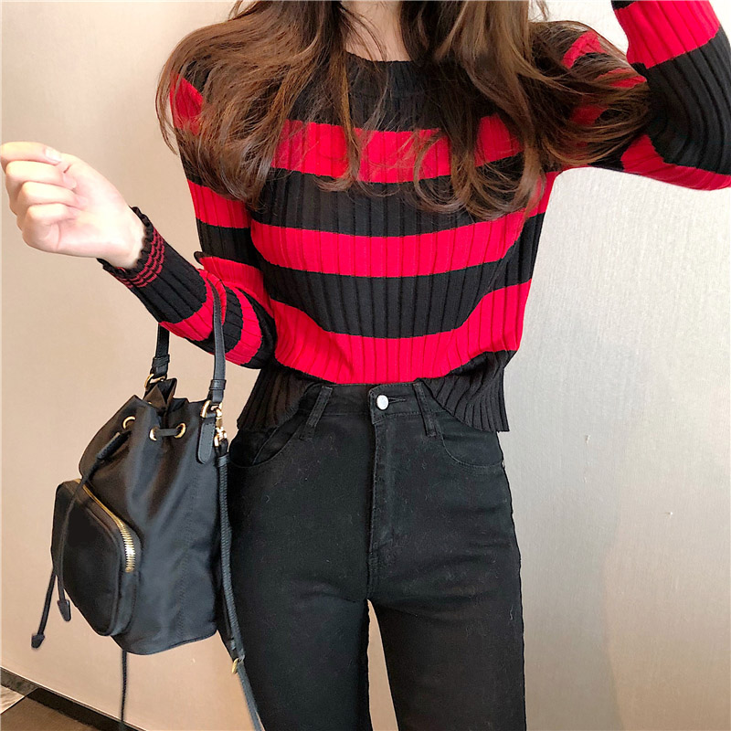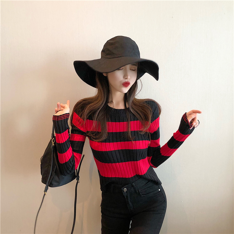 chic上衣女2018秋裝新款韓風百搭圓領條紋復古時尚針織衫打底衫潮