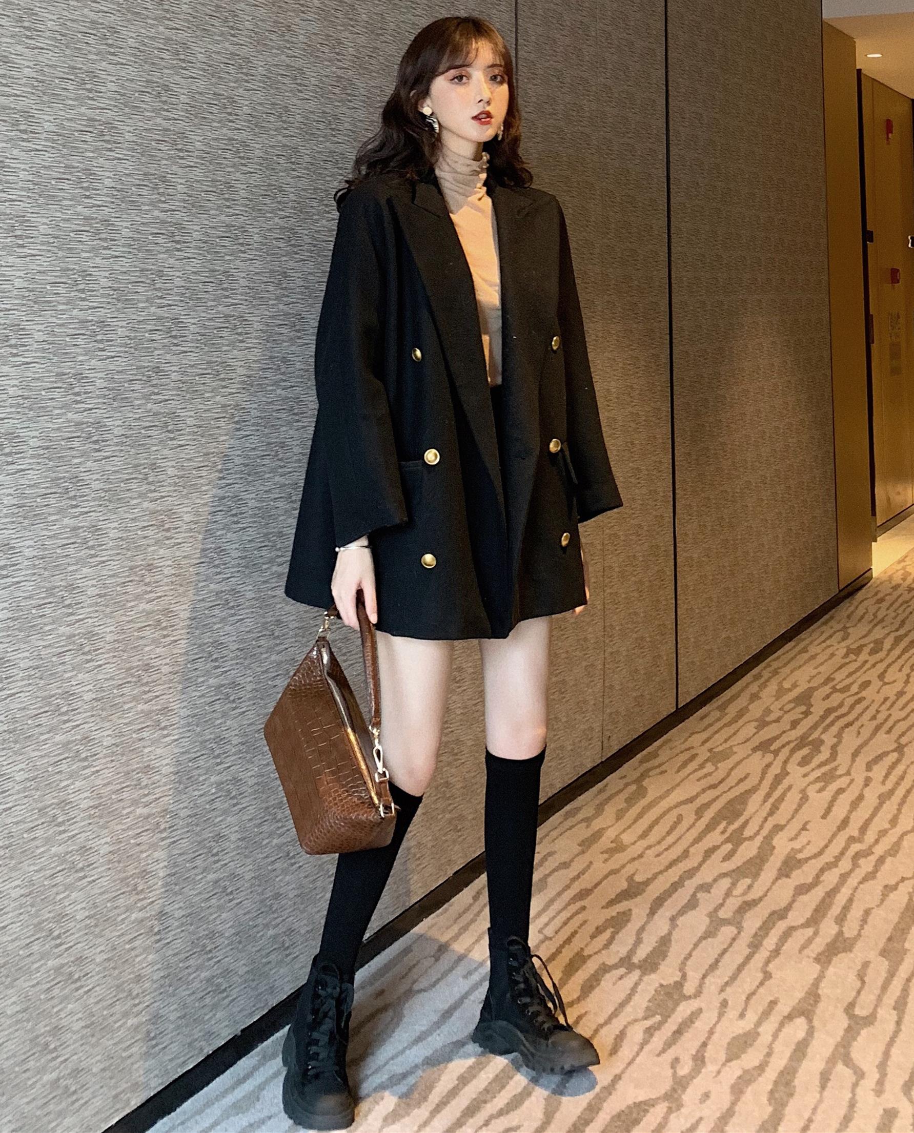 秋冬新款雙排扣呢子大衣外套時尚套裝呢子百褶裙褲chic氣質兩件套