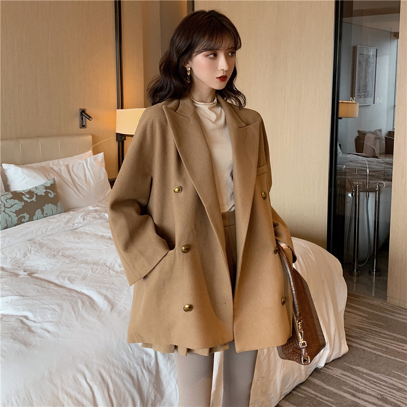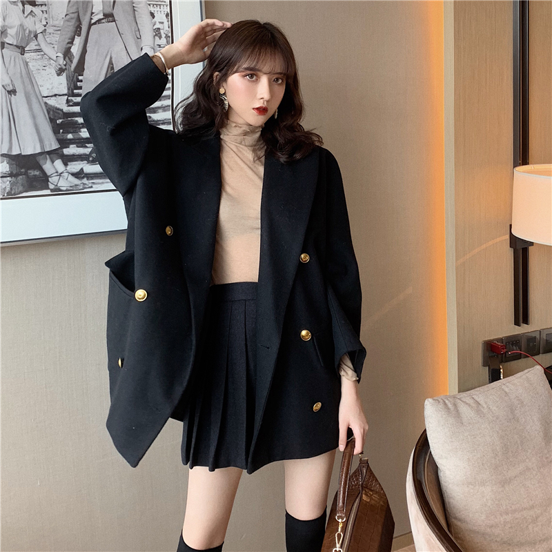 / 秋冬新款雙排扣呢子大衣外套時尚套裝呢子百褶裙褲chic氣質兩件套