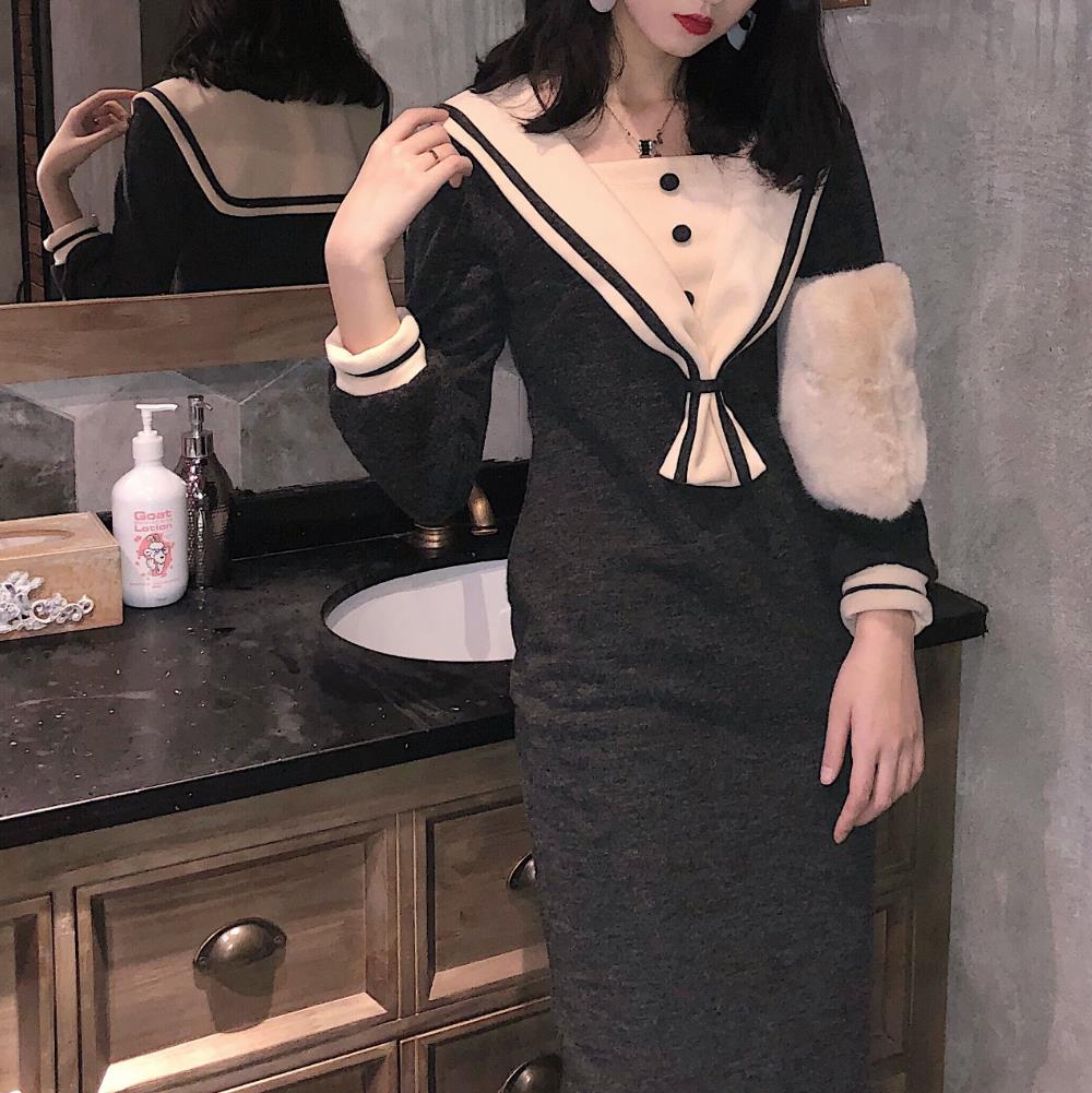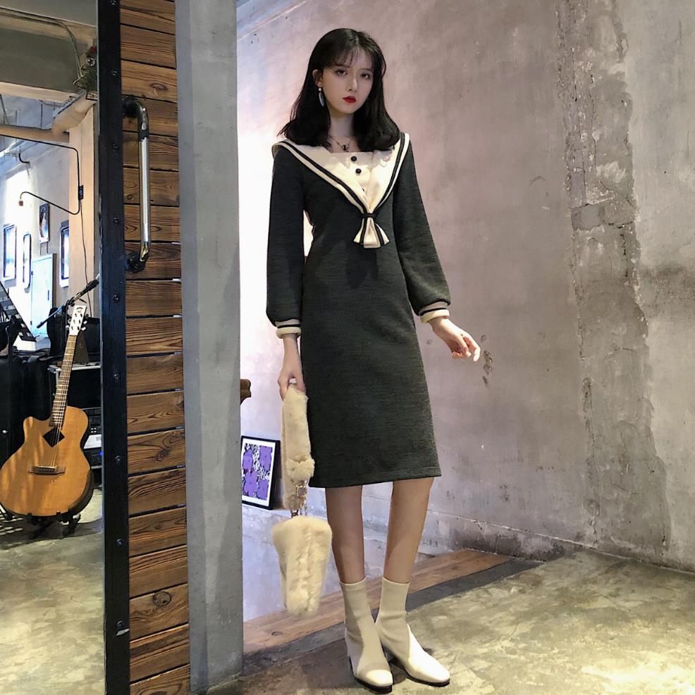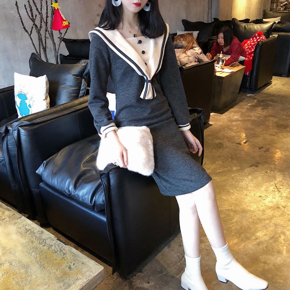 / 2018韓版秋裝新款時尚中長裙復古chic百搭氣質水手服打底連衣裙女