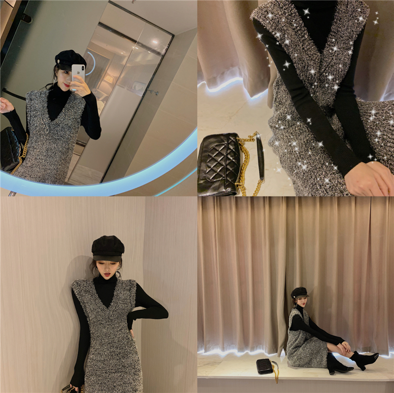 / 2018秋冬新款閃閃亮絲無袖V領套頭背心裙純色修身打底衫時尚套裝