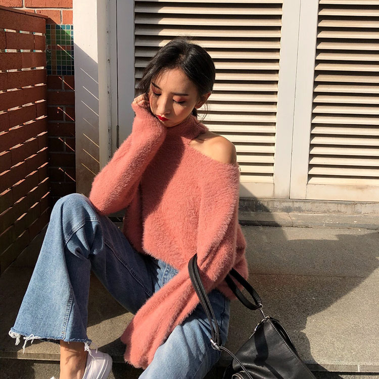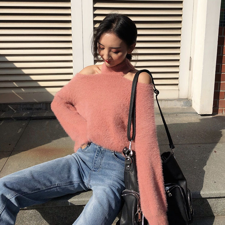 / 秋裝新款復古chic百搭小心機設計感時尚純色氣質毛絨掛脖露肩毛衣