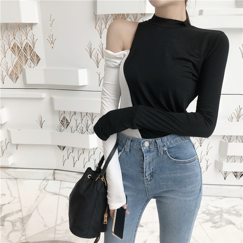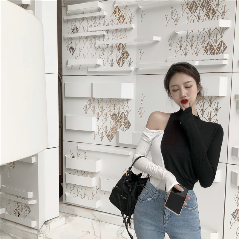 / chic早秋新款韓版百搭時尚小心機黑白拼接打底T恤露肩設計上衣女
