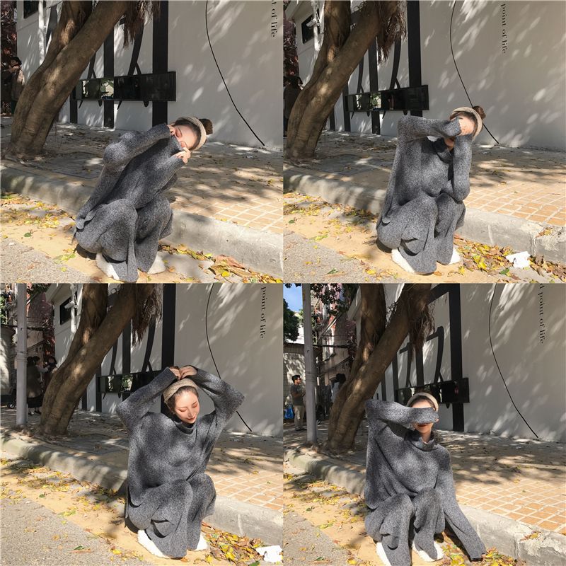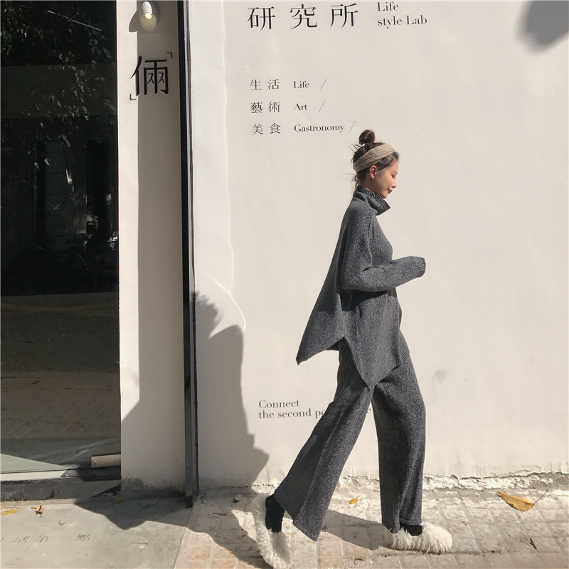 / 復古慵懶寬松加厚保暖高領毛衣高腰顯瘦針織闊腿褲時尚套裝兩件套