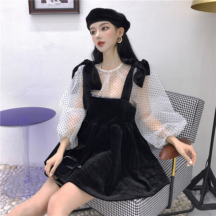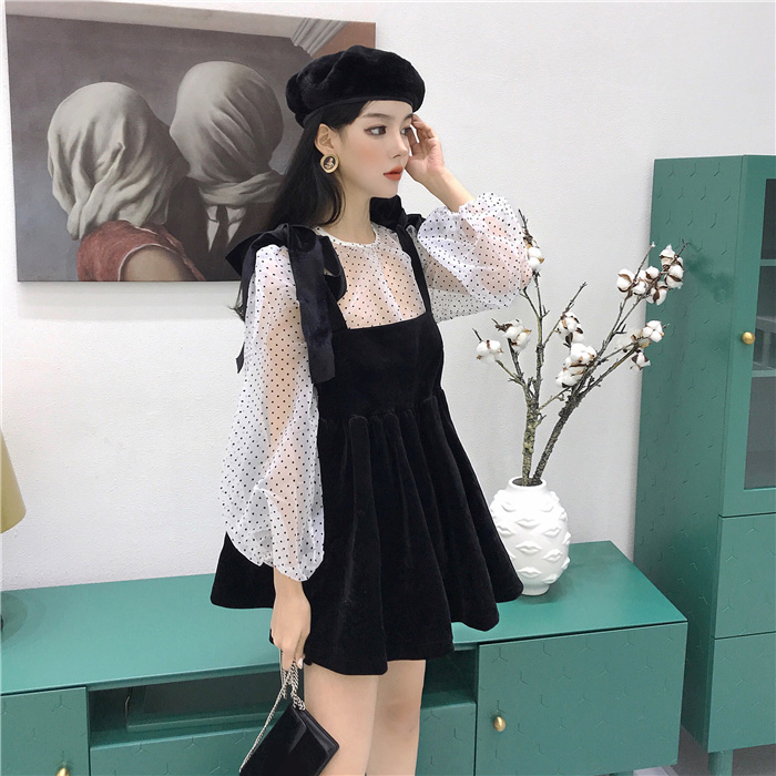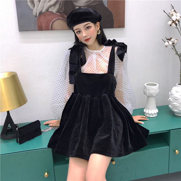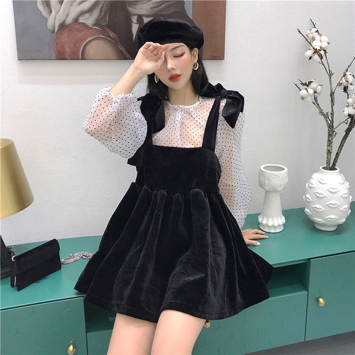 2018秋冬新款韓版時尚套裝波點長袖罩衫蝴蝶結絲絨吊帶裙兩件套潮