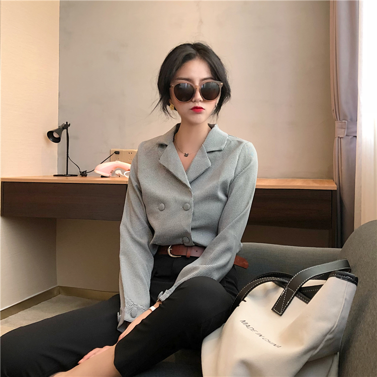 2018新款韓版時尚套裝chic復古翻領格子小西裝外套休閑褲配皮帶潮