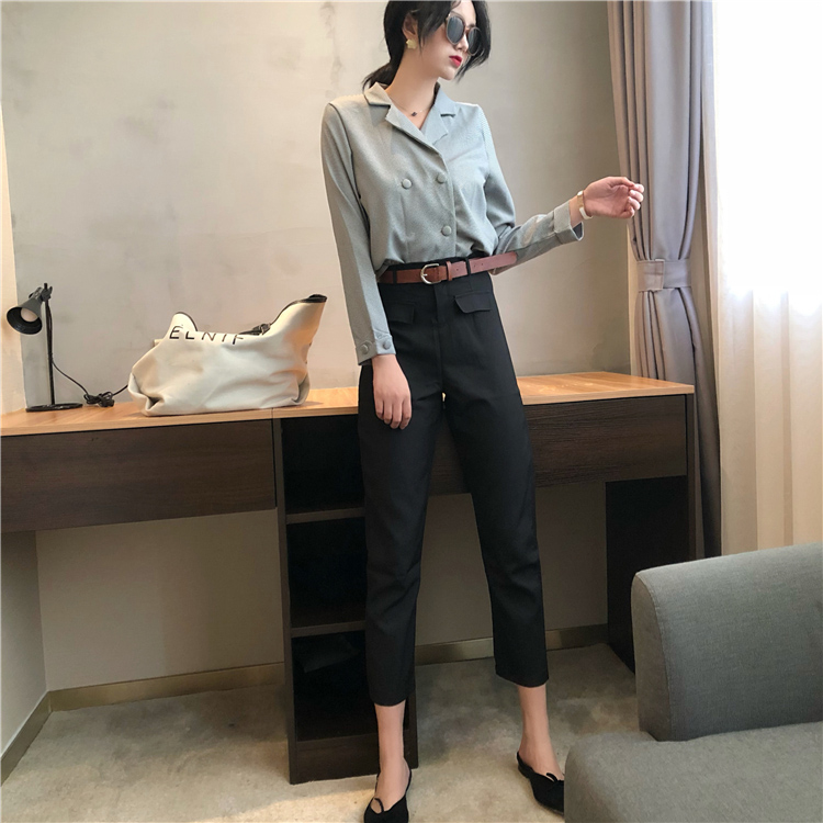 / 2018新款韓版時尚套裝chic復古翻領格子小西裝外套休閑褲配皮帶潮