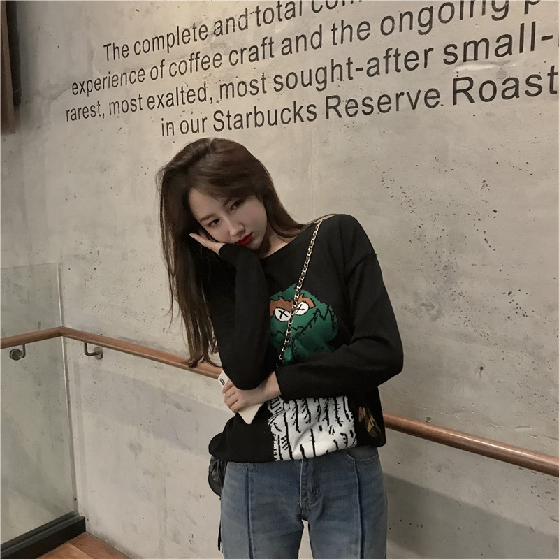 時尚慵懶風套頭毛衣女2018新款秋冬韓版可愛卡通百搭寬松版針織衫