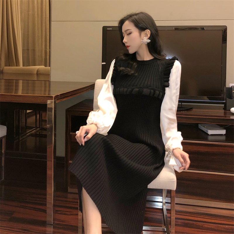 女裝秋冬2018新款女溫柔風拼接假兩件針織連衣裙女復古長袖桔梗裙