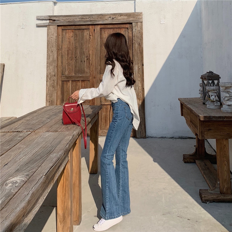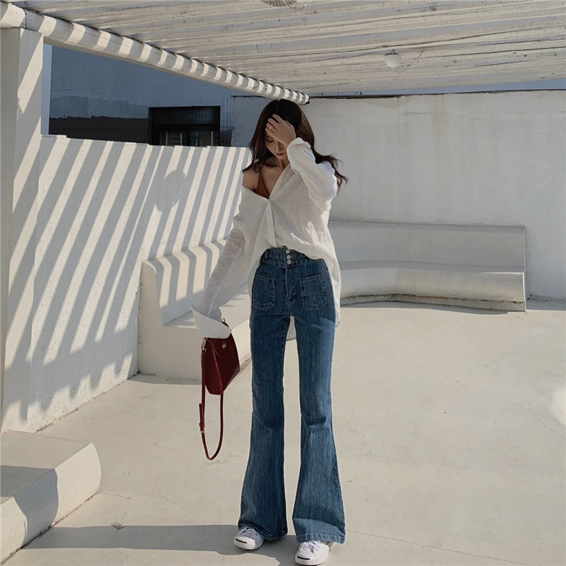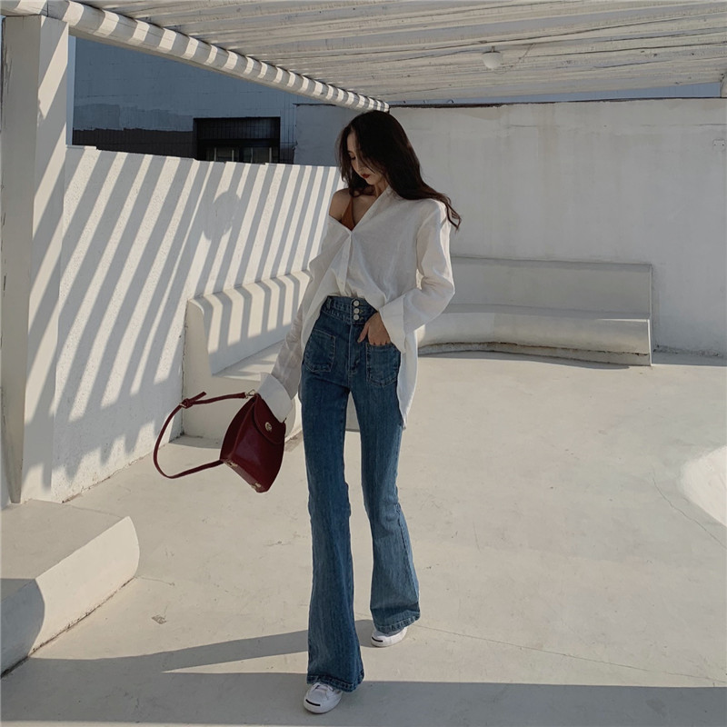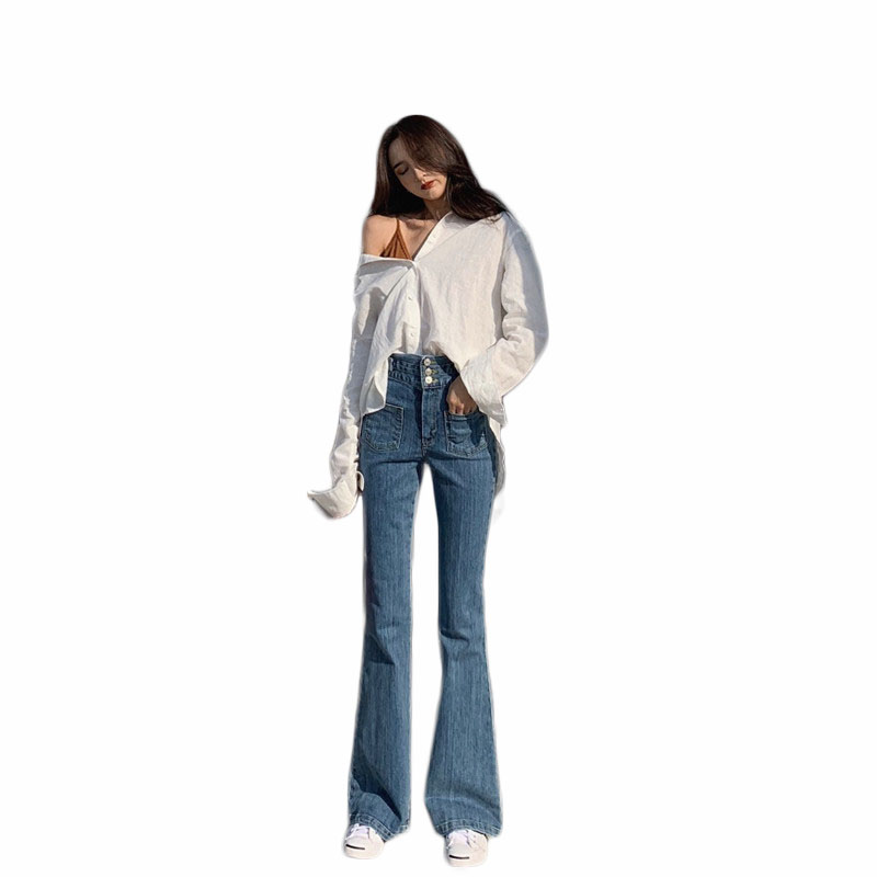 chic韓版顯瘦高腰褲子女秋冬2018新款氣質排扣牛仔褲女微喇叭長褲