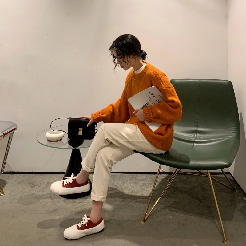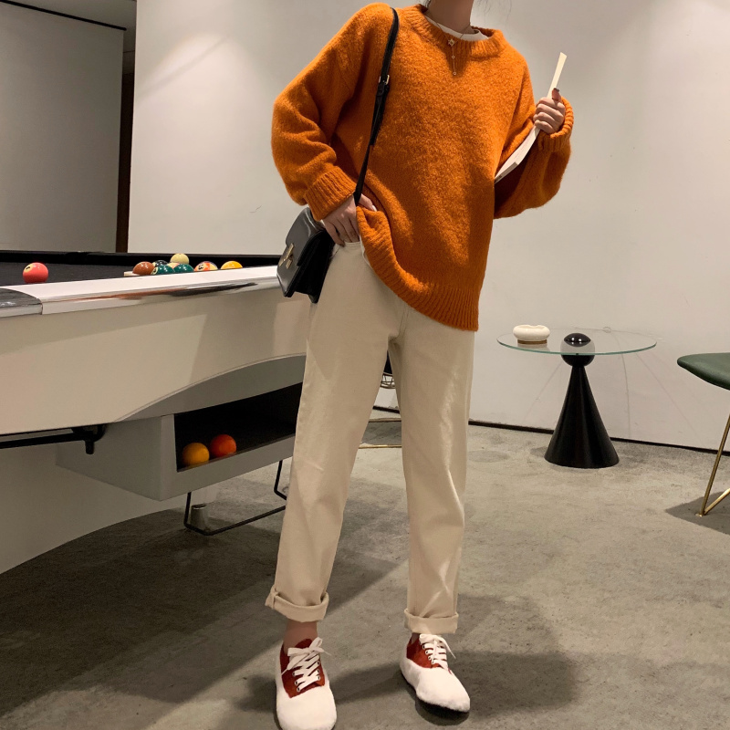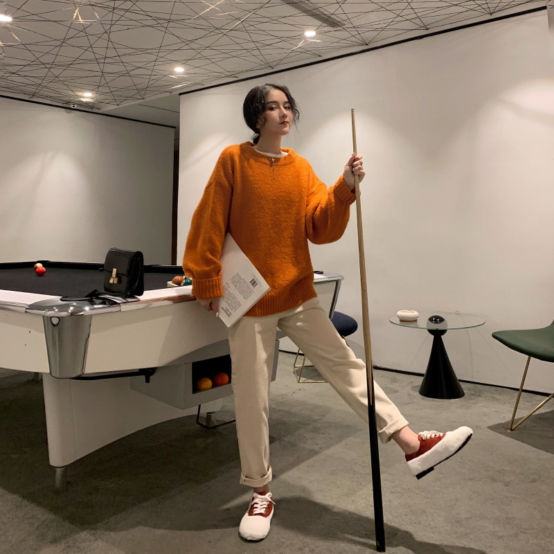 / 韓版女神套裝秋冬寬松套頭加厚慵懶風毛衣女+高腰直筒闊腿九分褲