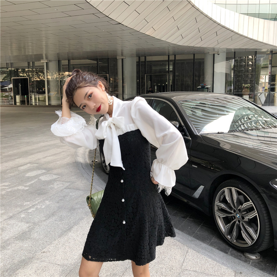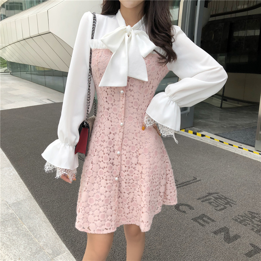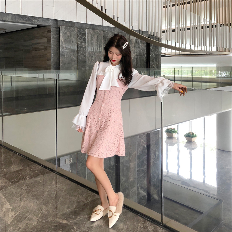 小香風2018新款韓版甜美百搭系帶蝴蝶結蕾絲拼接雪紡收腰連衣裙女