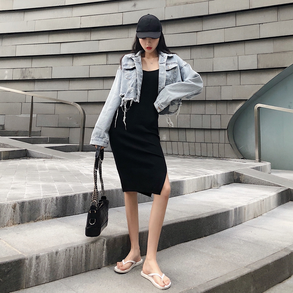 / 晚晚風女2018初秋時尚網紅復古港味牛仔外套吊帶裙兩件套氣質套裝