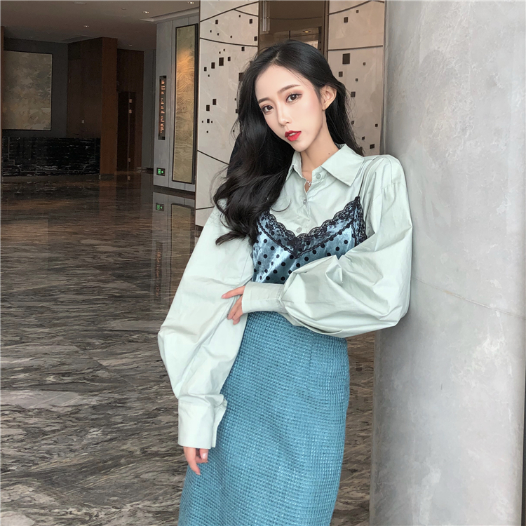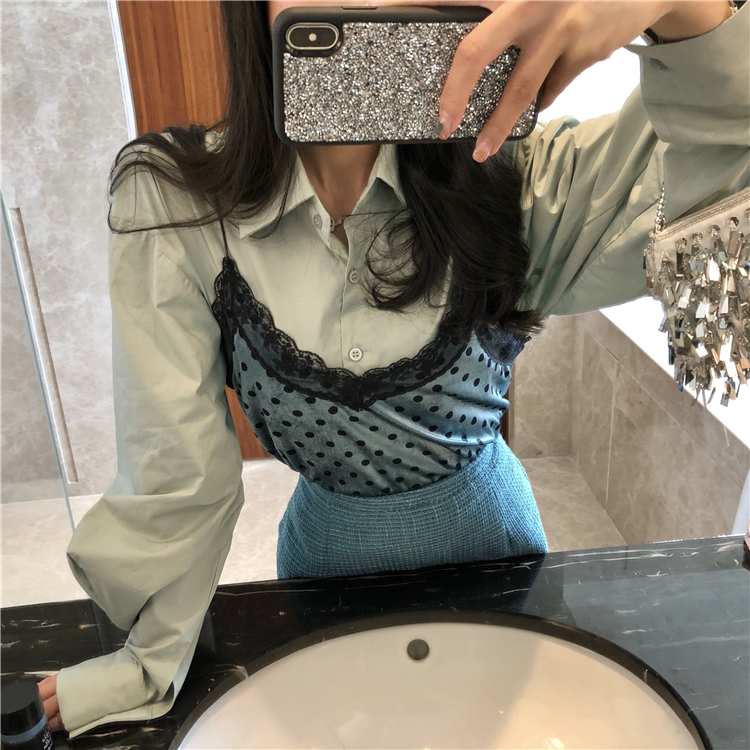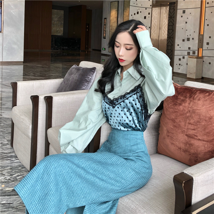 新品港味復古寬松波點吊帶襯衣時尚套裝中長款氣質包臀裙三件套女