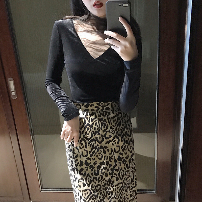 秋冬新款韓版上衣女裝修身顯瘦打底長袖設計感V領網紗拼接絲絨T恤