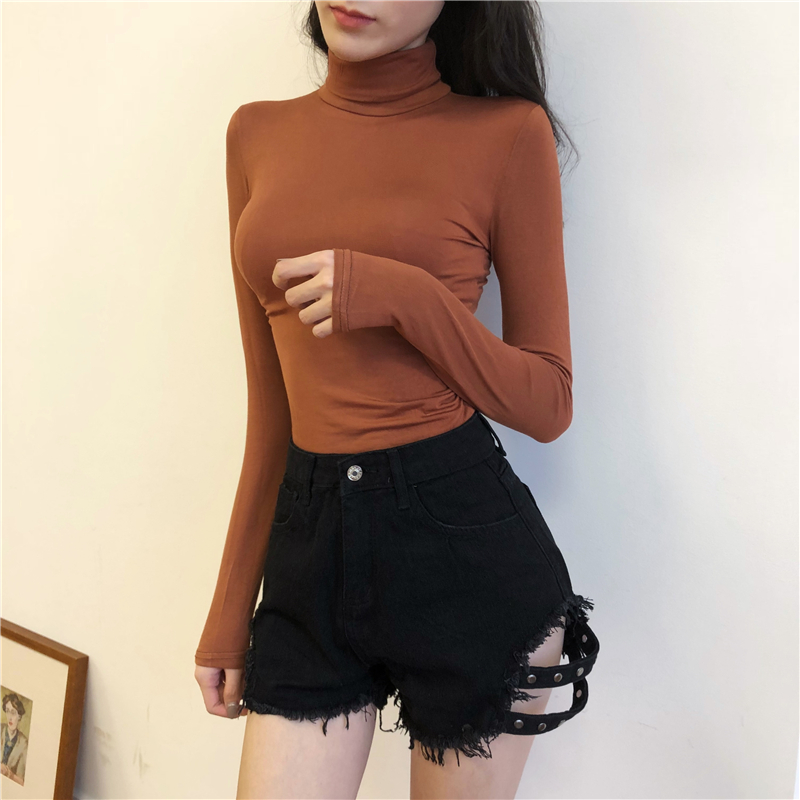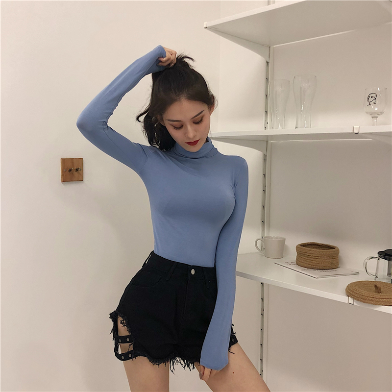 秋季chic新款時尚上衣修身顯瘦長袖高領T恤純色學生緊身打底衫女