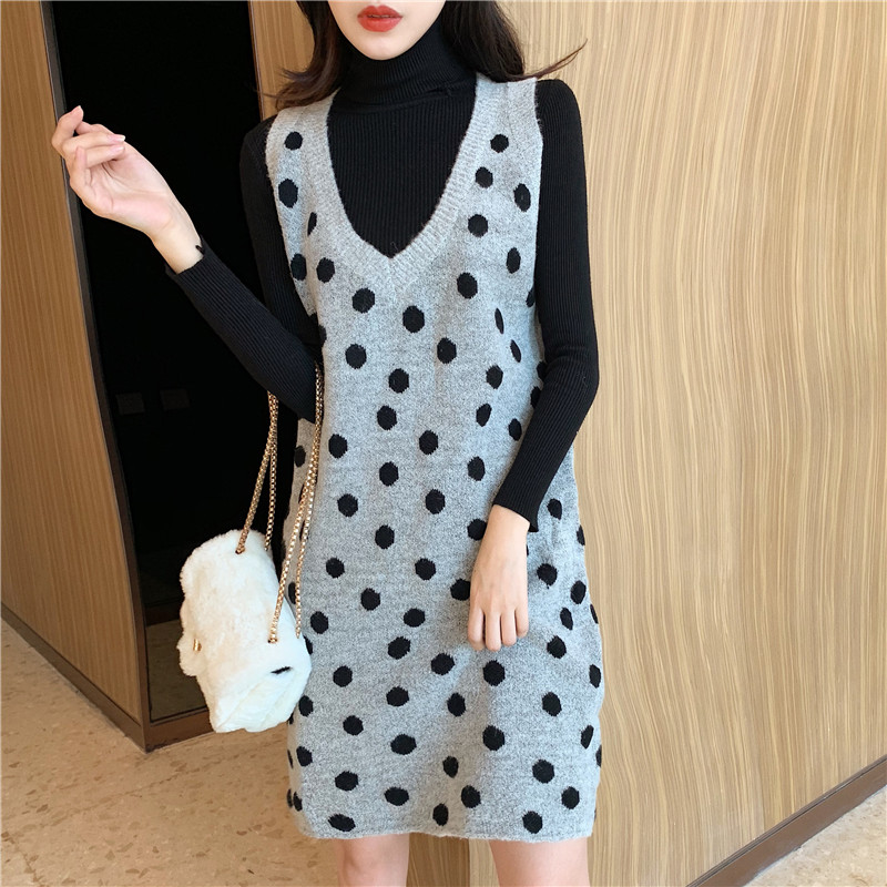 / 新款百搭復古v領中長款毛衣馬甲背心裙時尚套裝高領打底衫兩件套