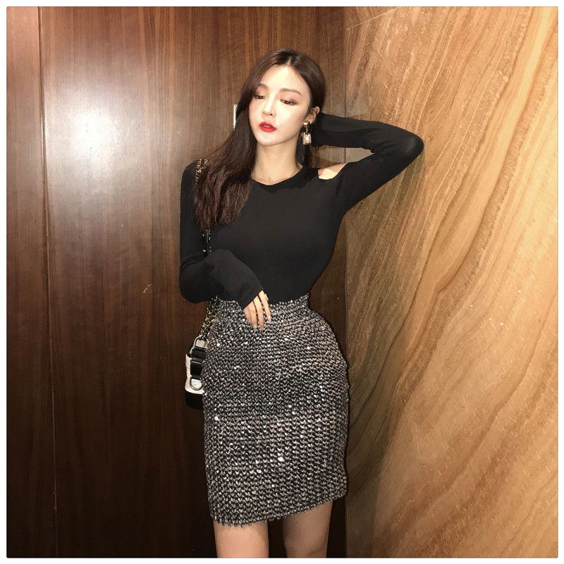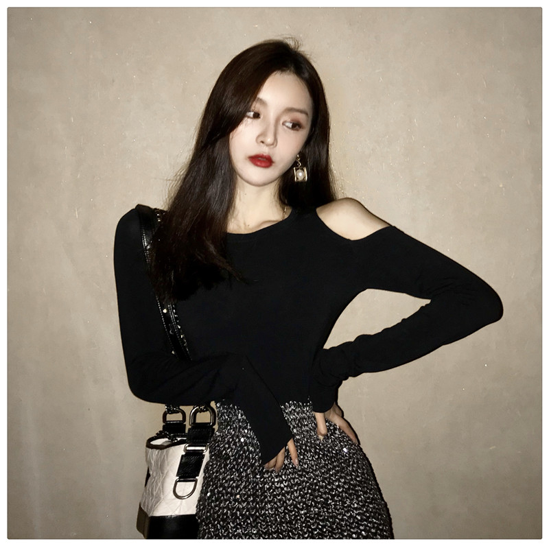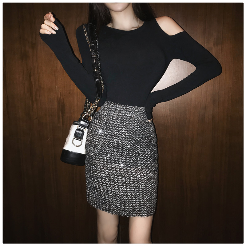 / 新款修身露肩T恤高腰包臀半身裙兩件套秋裝韓版港風氣質套裝女潮