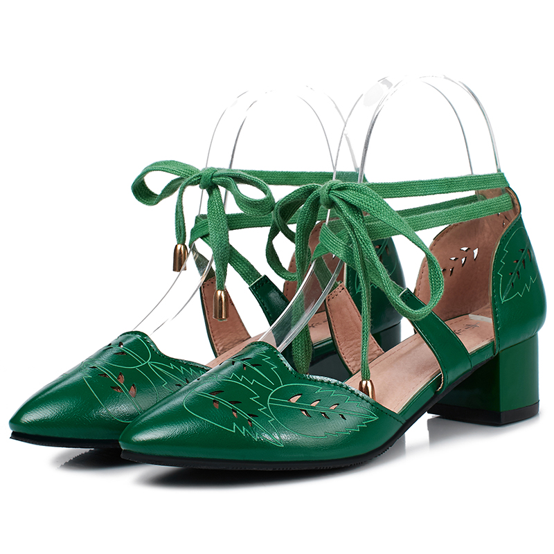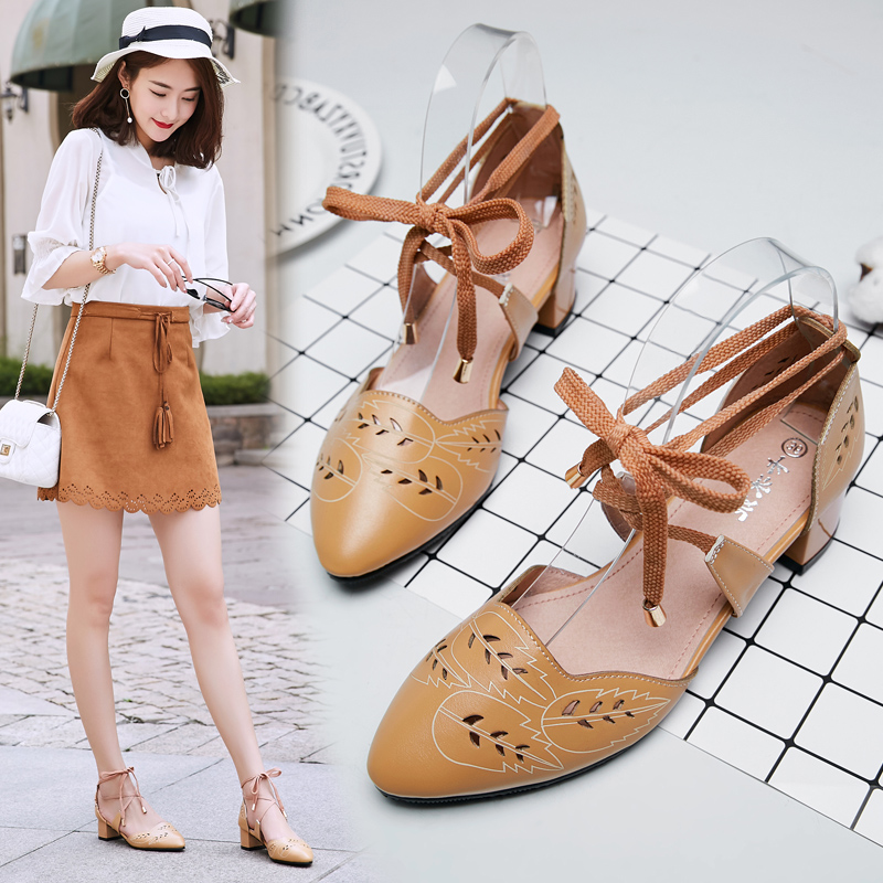 / 夏季新款綁帶鏤空包頭淺口洞洞鞋中空時尚尖頭粗跟中跟女涼鞋