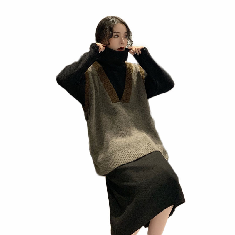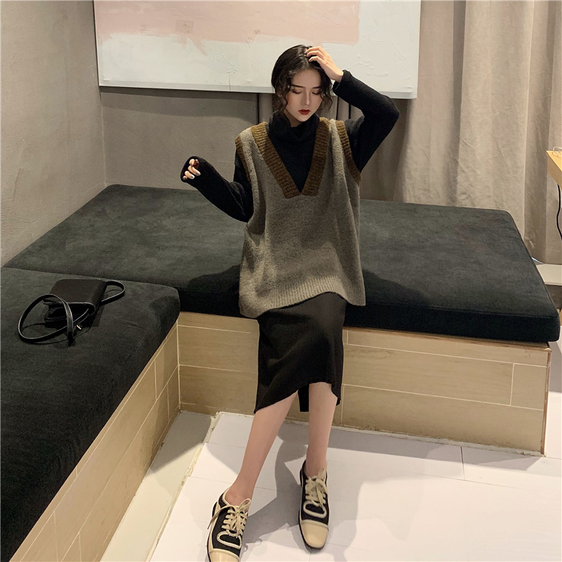 / 撞色V領毛衣馬甲小背心+高領加厚黑色毛衣女2018新款+毛呢半身裙