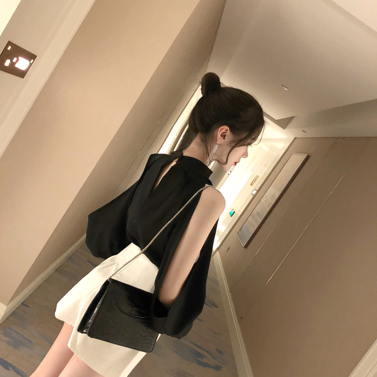 2018秋裝新款韓版時尚套裝掛脖v領露肩燈籠袖雪紡衫燈籠褲兩件套