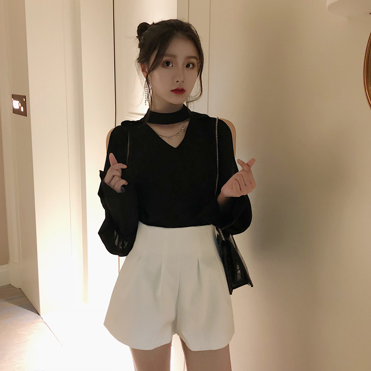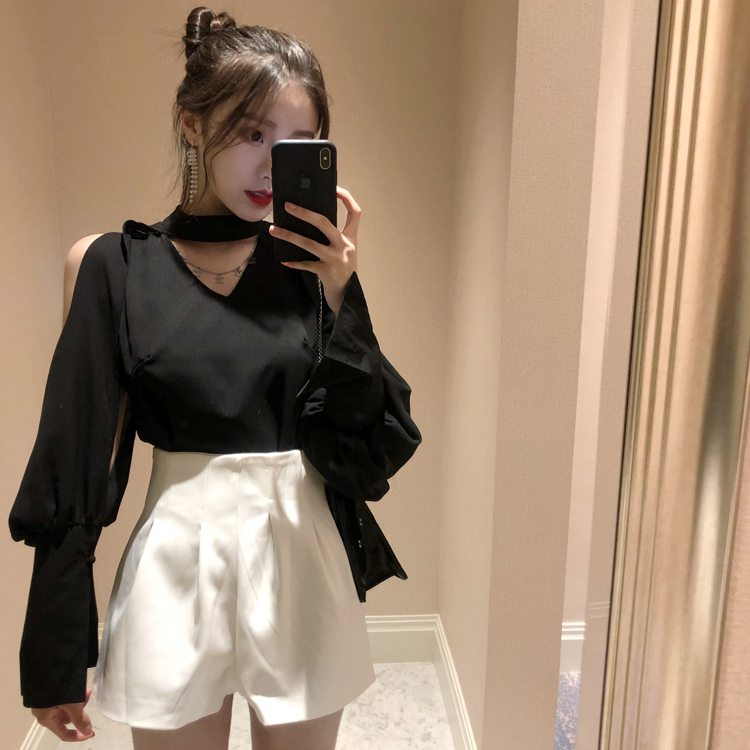 / 2018秋裝新款韓版時尚套裝掛脖v領露肩燈籠袖雪紡衫燈籠褲兩件套