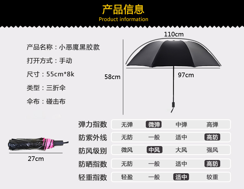 創意晴雨傘小惡魔黑膠防曬戶外遮陽太陽傘兩用折疊傘三折傘