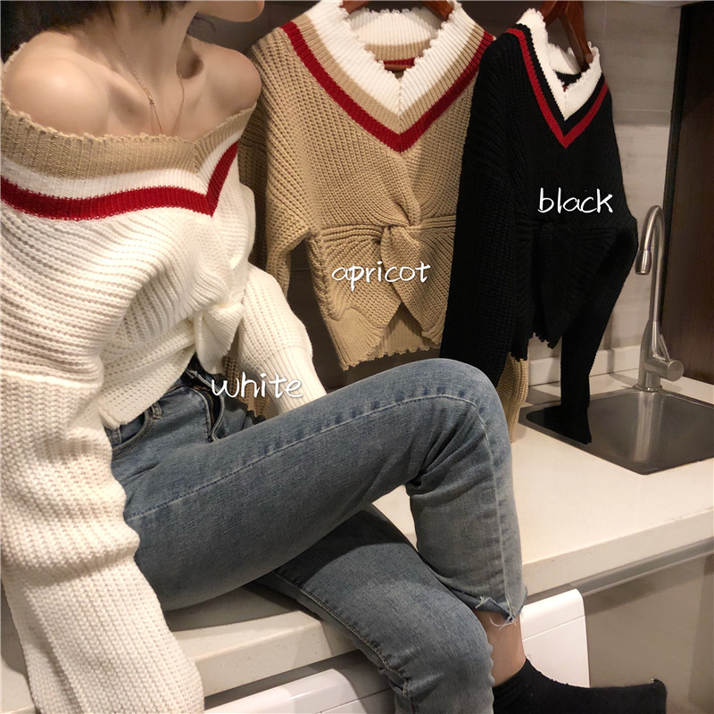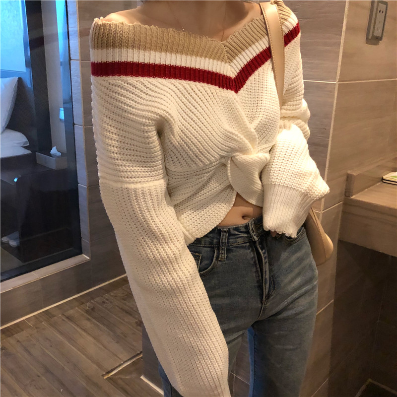 2018新款V領一字肩兩穿小心機復古chic交叉針織條紋撞色長袖毛衣