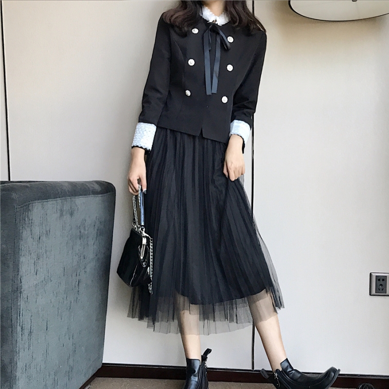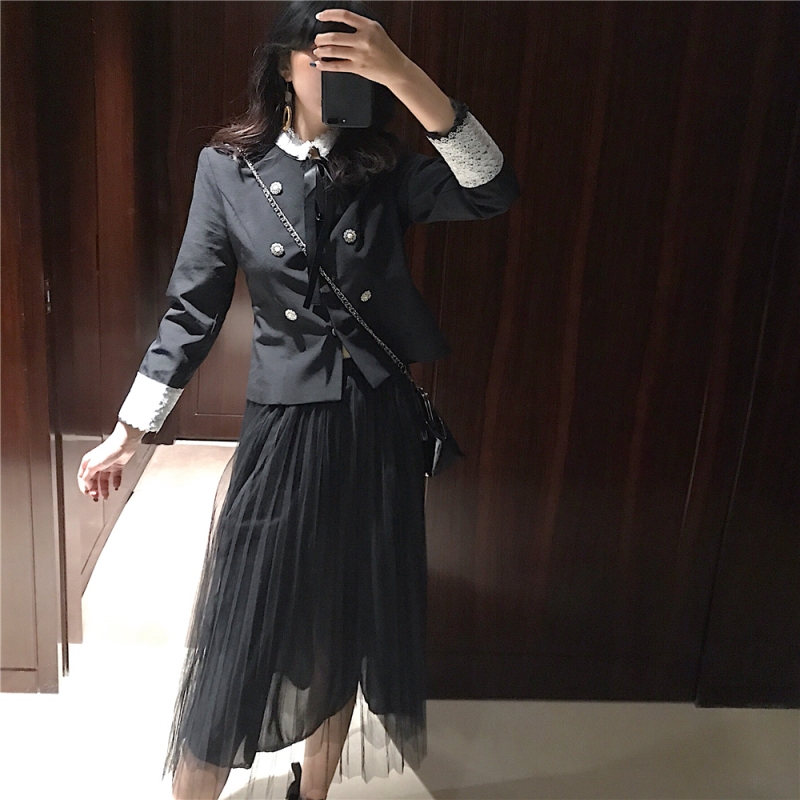 / 秋裝女2018新款蝴蝶結修身短款花邊小西服外套+中長網紗半身裙女