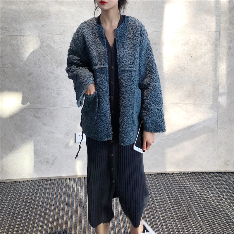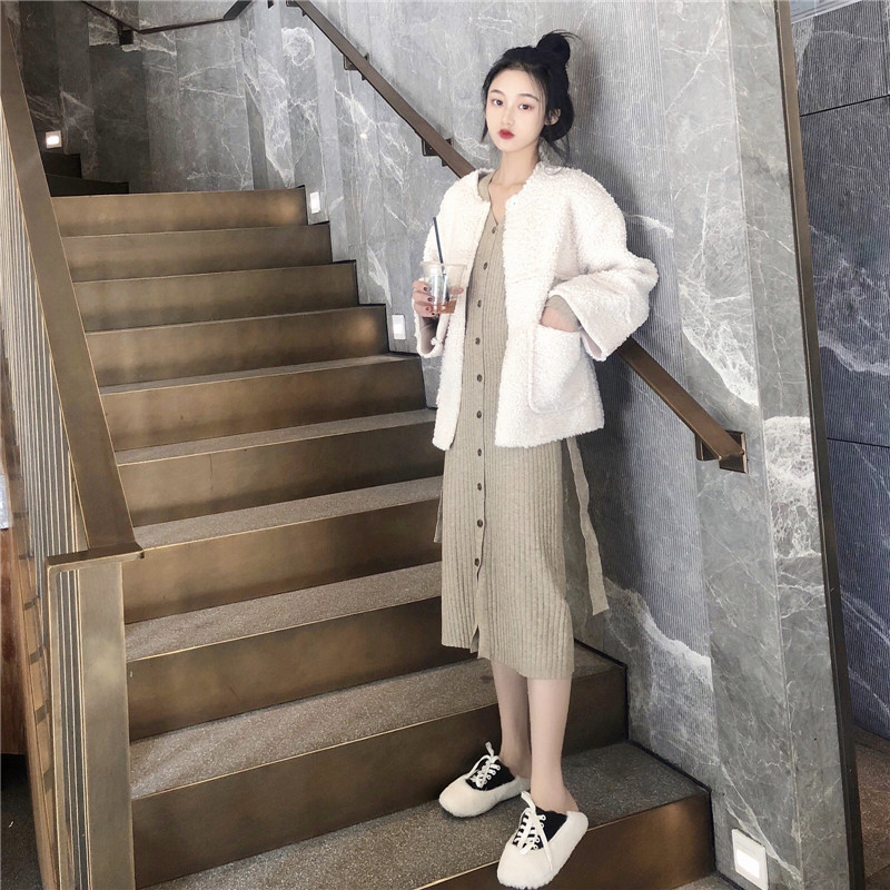 / 韓國復古風修身坑條長袖針織連衣裙兩件套寬松加厚外套時尚套裝女