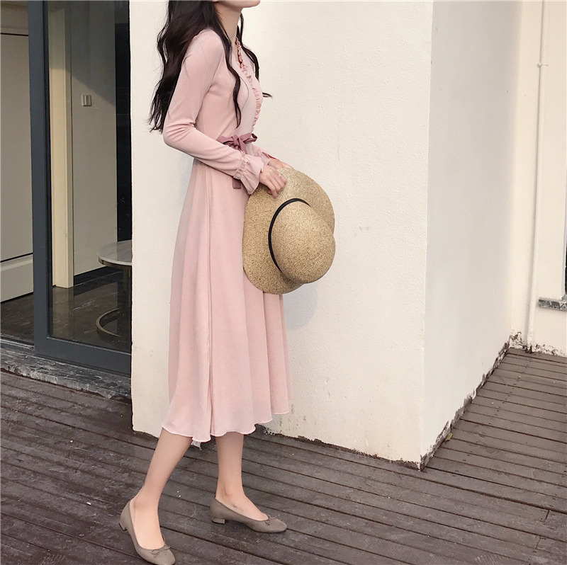 / 晚晚風新款韓版百搭中長款森女系時尚小清新chic花邊系帶連衣裙潮