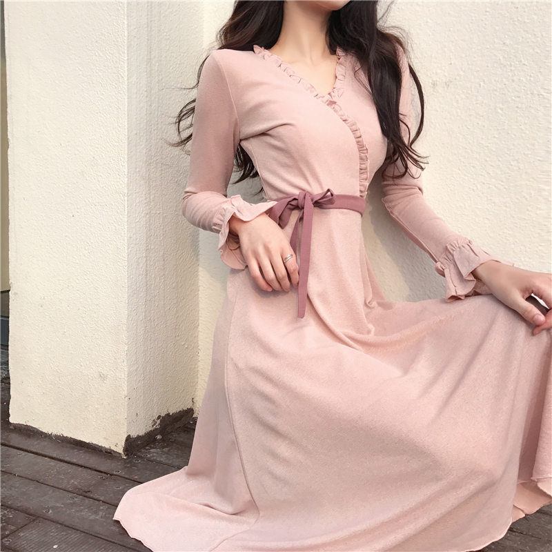 晚晚風新款韓版百搭中長款森女系時尚小清新chic花邊系帶連衣裙潮