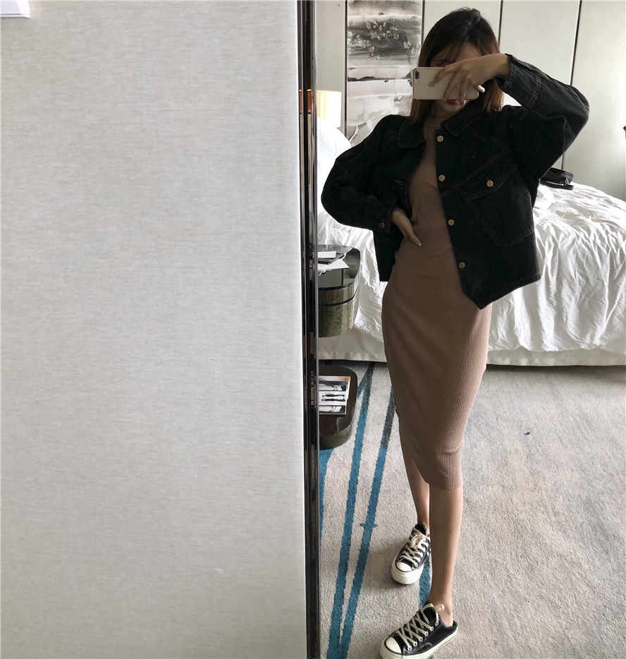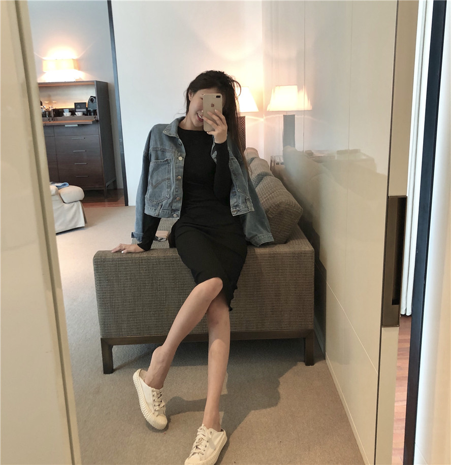 黑灰色牛仔外套|藍色牛仔外套|粉色連衣裙|黑色連衣裙|卡其色連衣裙