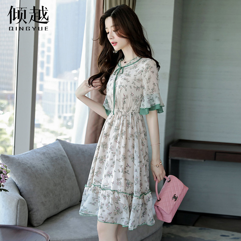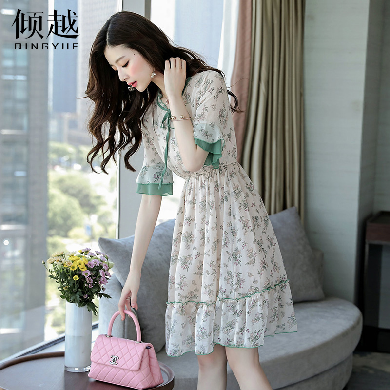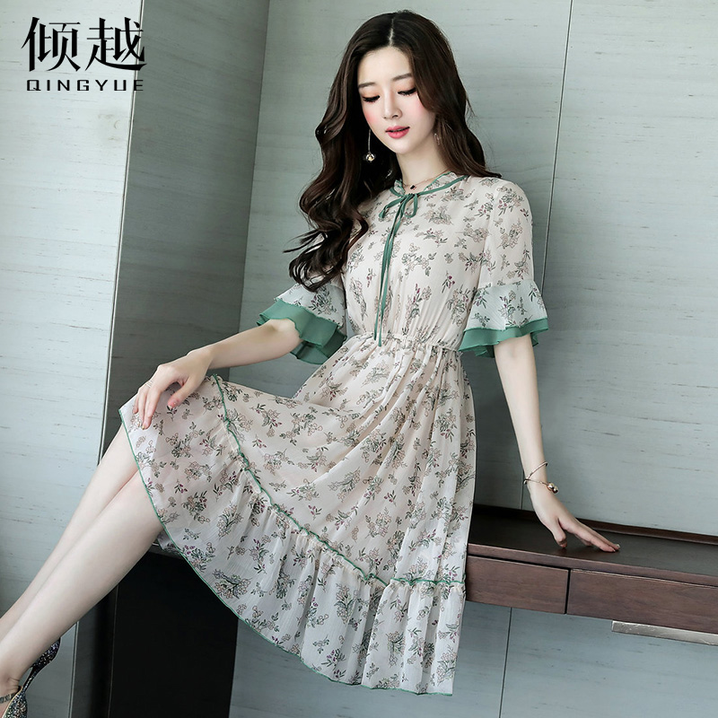 2017夏季新款女裝小清新五分袖中長款系帶拼接碎花印花雪紡連衣裙
