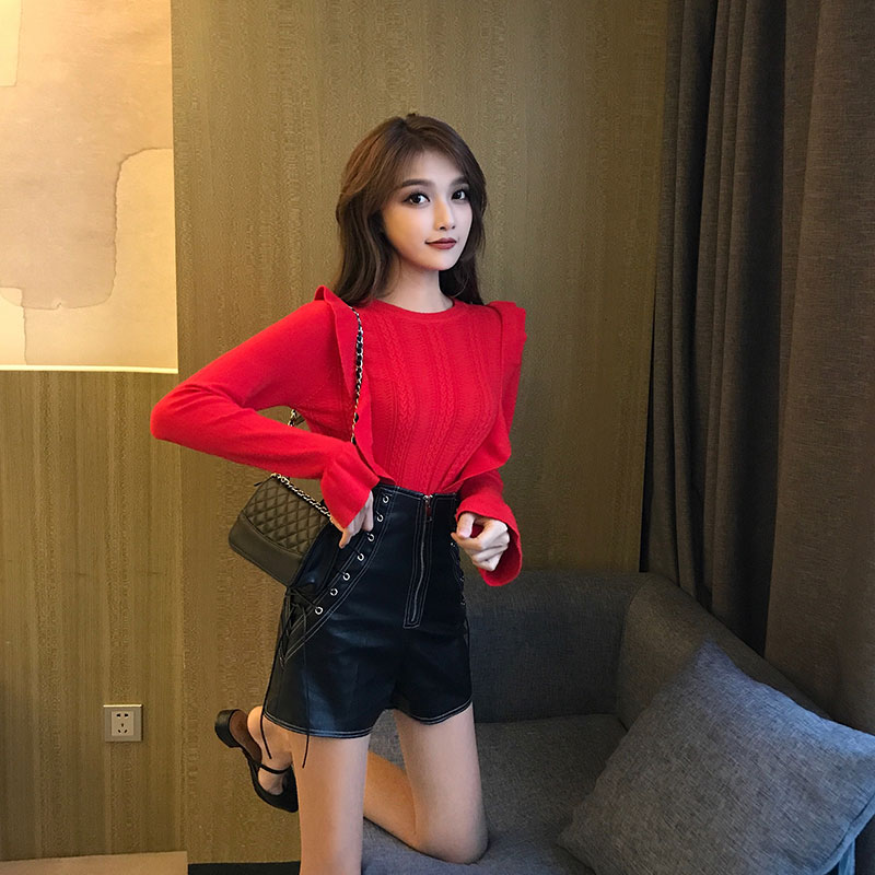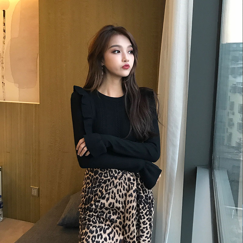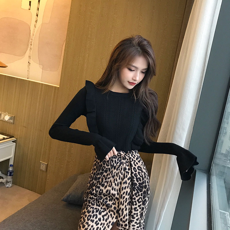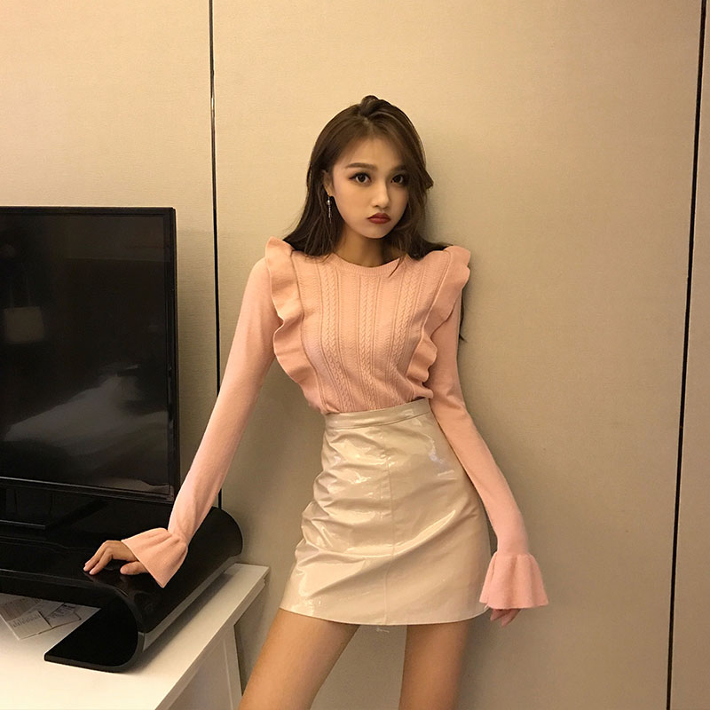 新款韓版復古chic純色2018秋冬女喇叭袖緊身圓領上衣打底針織衫潮