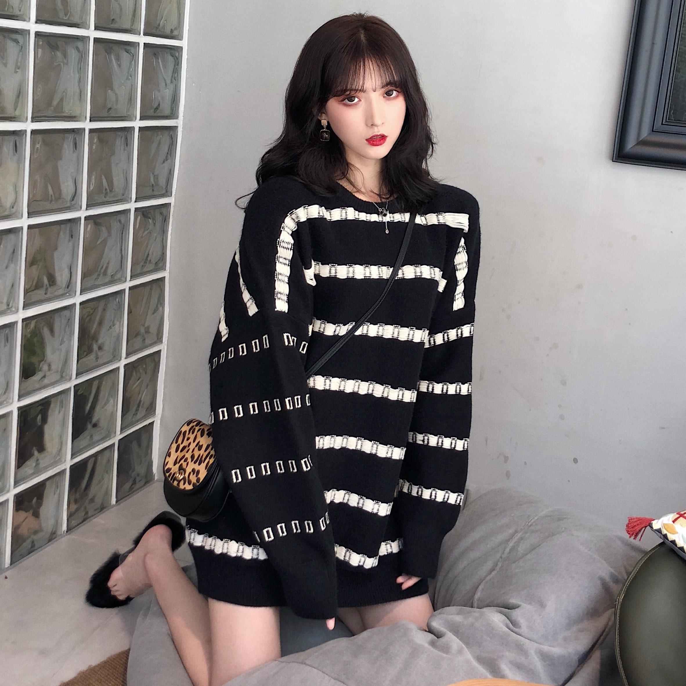 / 韓版chic百搭慵懶風oversize毛衣女寬松顯瘦條紋中長款減齡毛線衣
