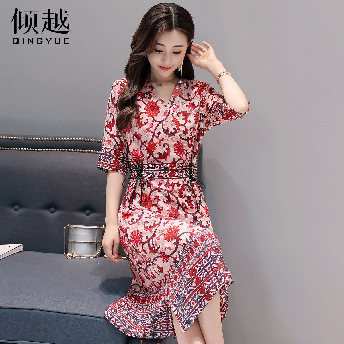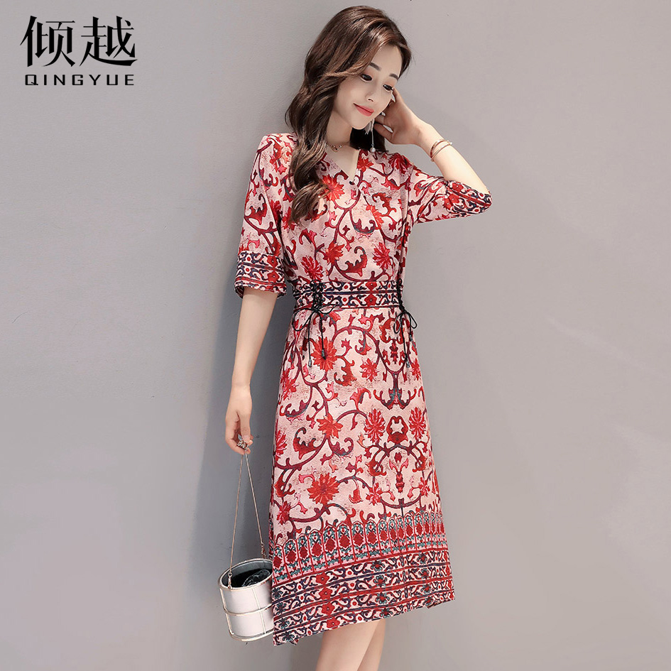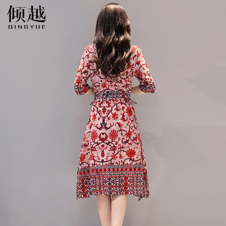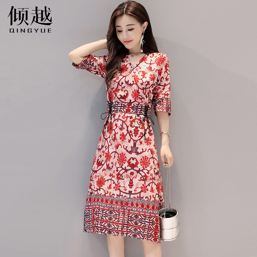 夏季印花連衣裙女韓版修身顯瘦復古氣質2017夏裝新款女裝a字裙子