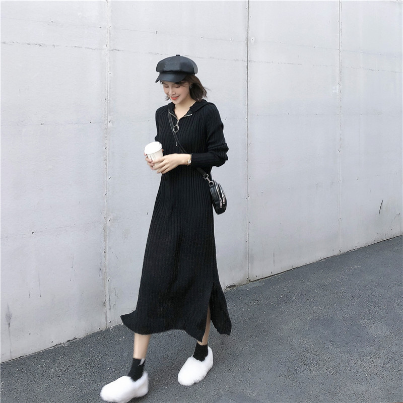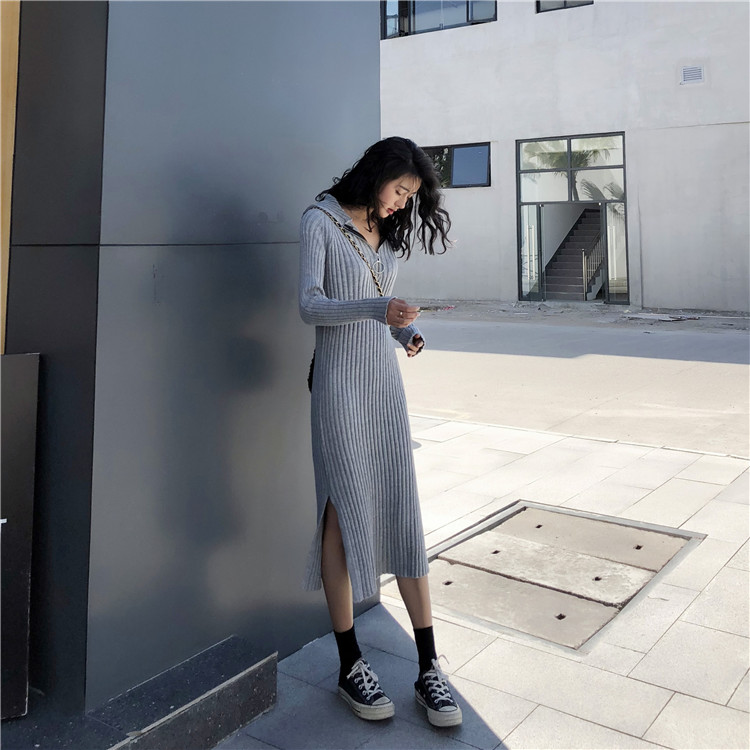 秋冬新款時尚chic百搭裙子連帽長款過膝毛衣裙長袖針織連衣裙女潮