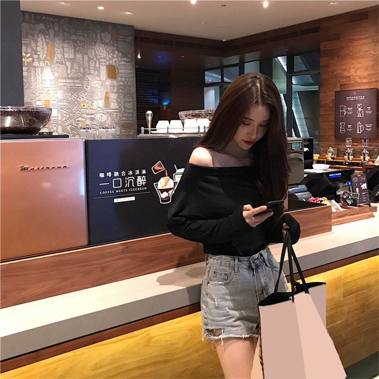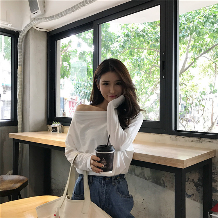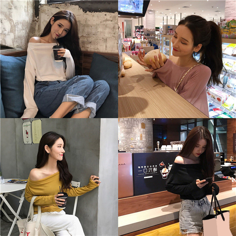 / 韓版2018新款純色氣質顯瘦長袖百搭打底衫露肩長袖t恤女寬松秋裝
