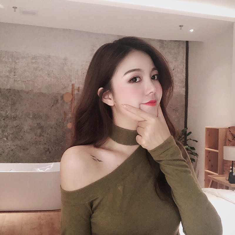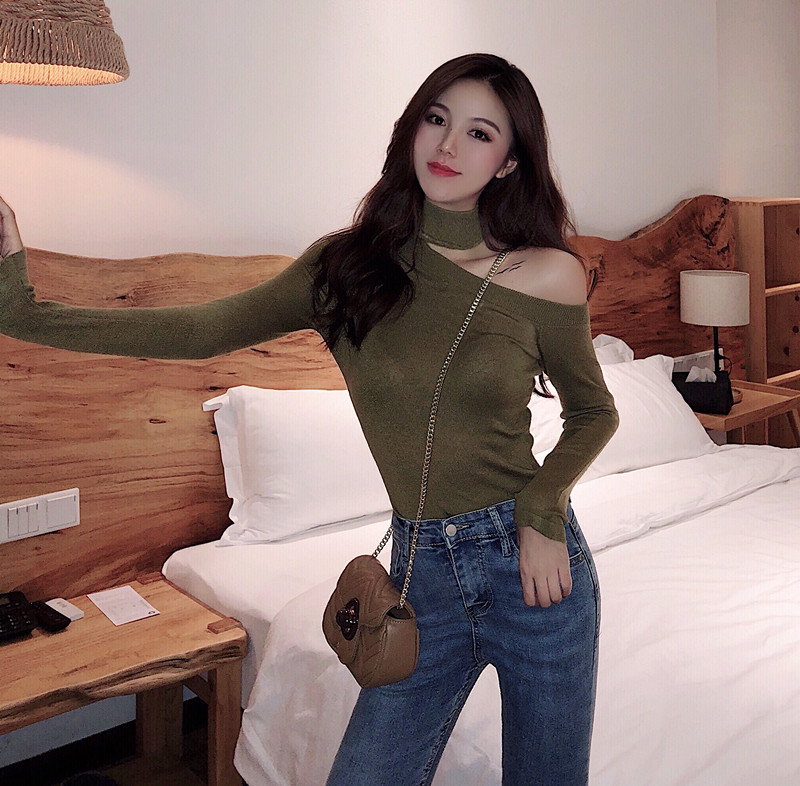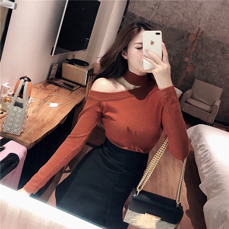 毛衣女2018新款韓版秋季時尚簡約修身顯瘦純色百搭露肩打底針織衫
