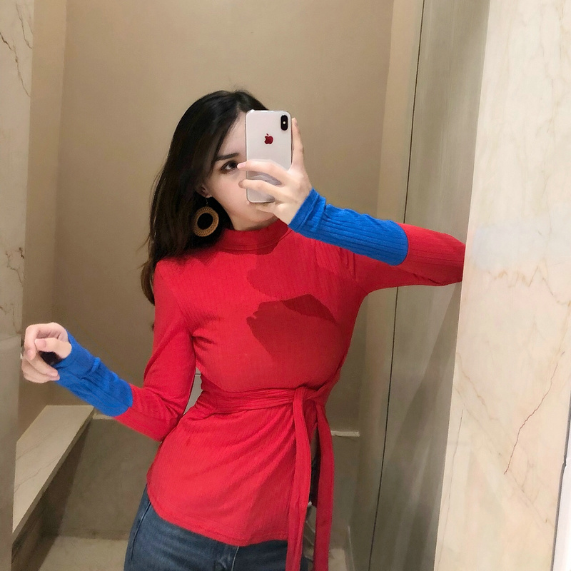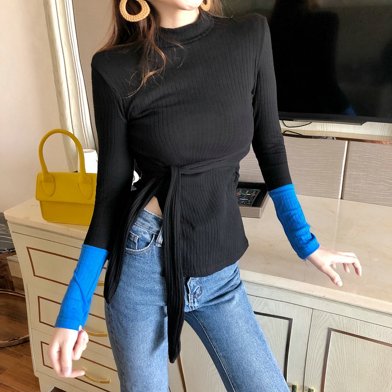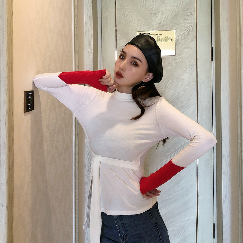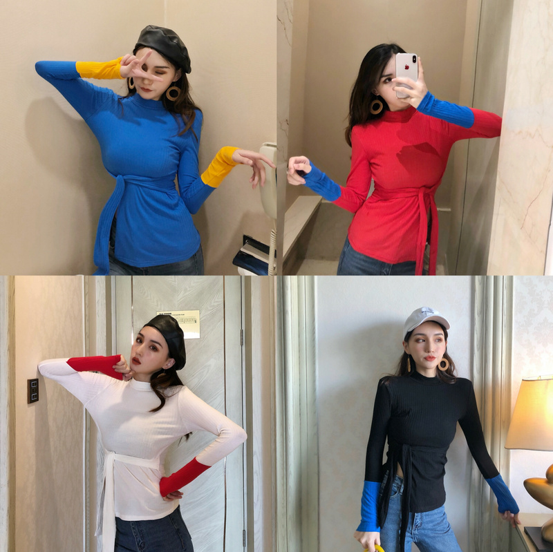 / 2018早秋港風時尚撞色拼接女長袖修身開叉系帶韓版高領百搭T恤潮