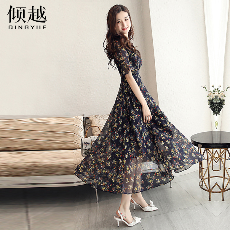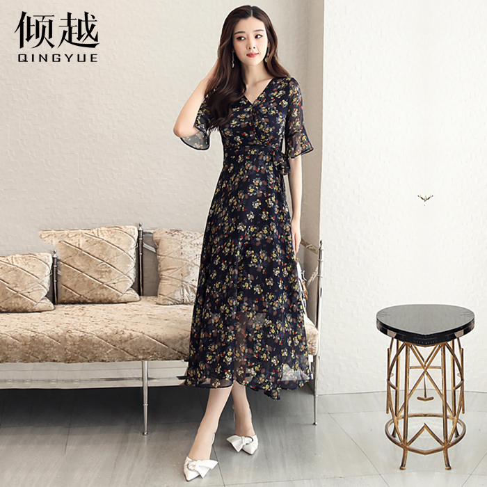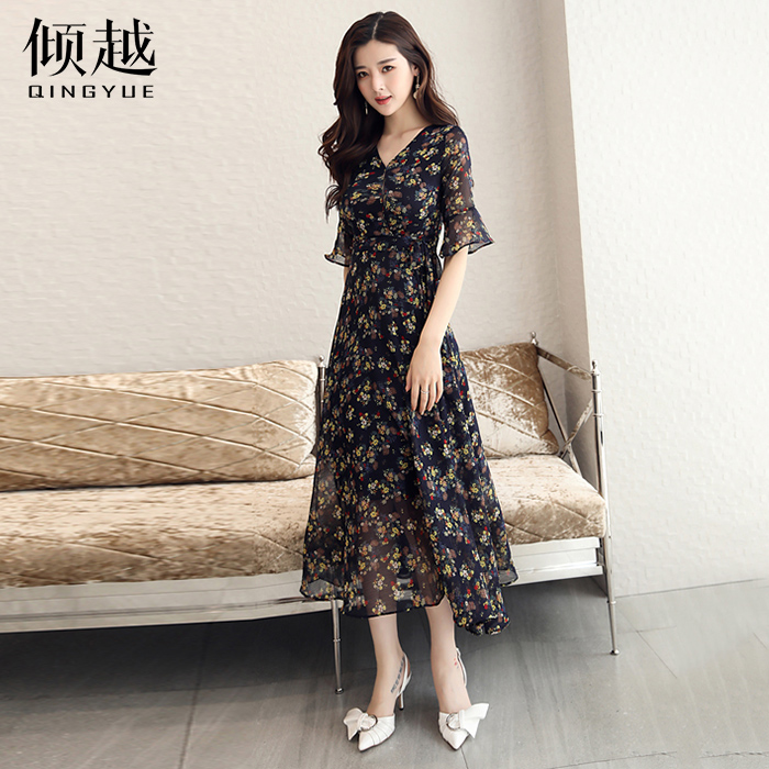 碎花雪紡連衣裙女裝長裙2017夏季新款時尚韓版顯瘦喇叭袖長款裙子